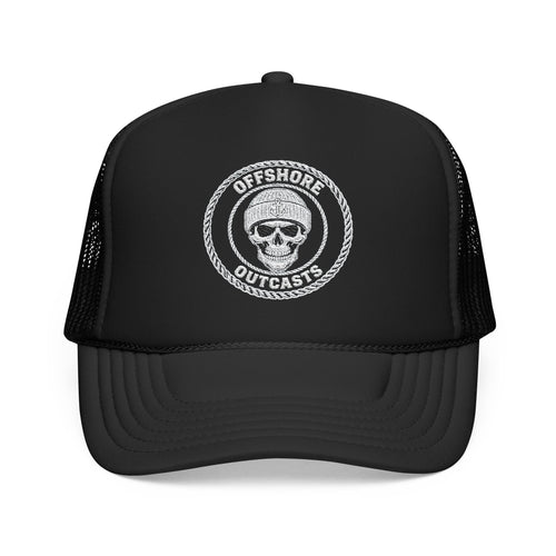 This foam trucker hat carries weathered, salty energy — a skull emblem ringed by a rope reads “Offshore Outcasts.” It sits high on the head with its structured five-panel foam front and mesh back, keeping its bold print crisp while letting air move through on long days outside. The pre-curved visor with eight rows of stitching and matching undervisor give it that lived-in, rugged look, while the adjustable snap keeps the fit secure whether you’re working the docks, heading out for a weekend run, or lounging at the marina.